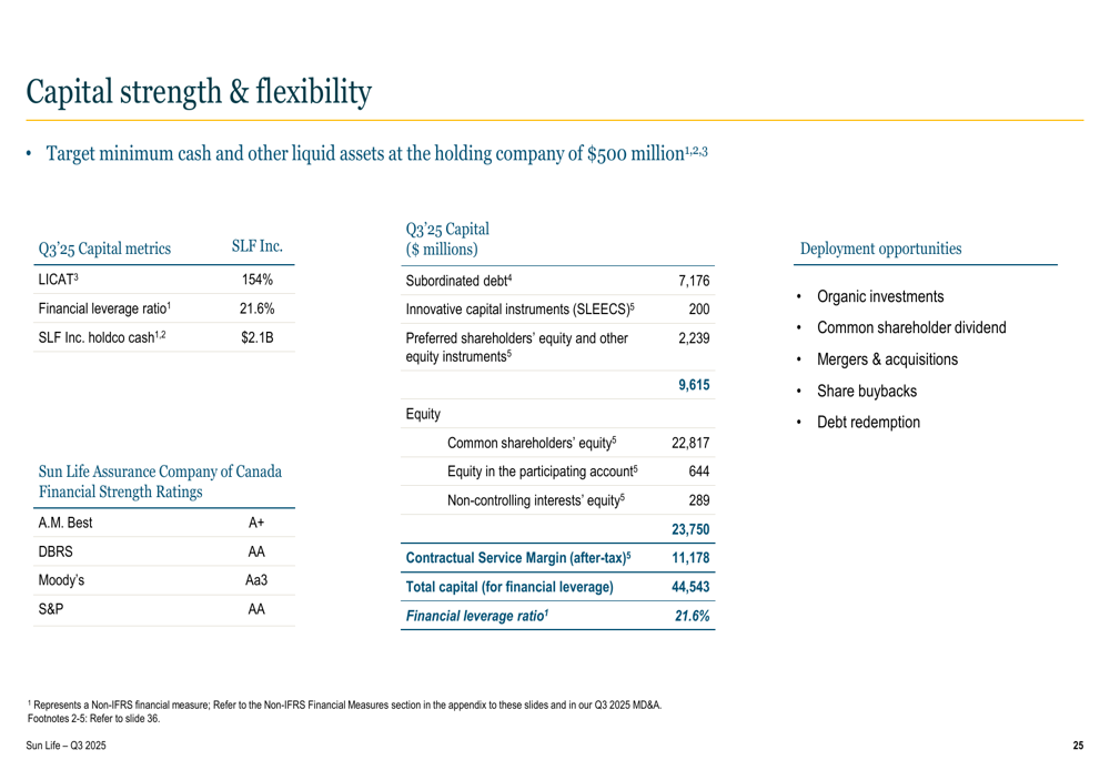 Sun Life maintained a robust capital position in Q3 2025, with a Life Insurance Capital Adequacy Test (LICAT) ratio of 154%, up 3 percentage points quarter-over-quarter. The company's financial leverage ratio stood at 21.6%, with $2.1 billion in holding company cash providing significant flexibility for capital deployment.