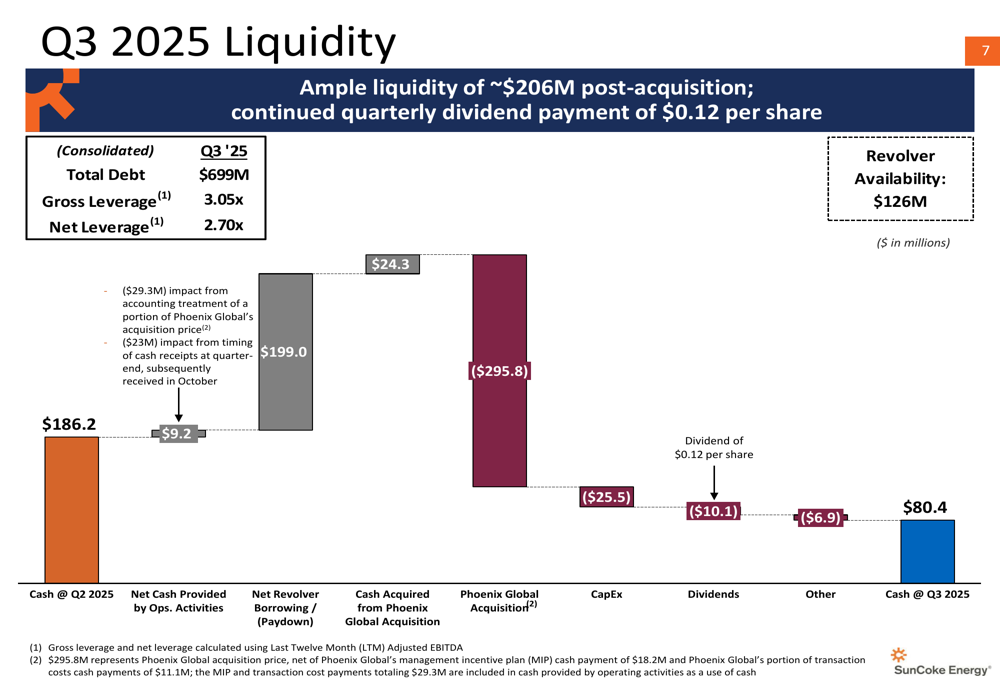The acquisition of Phoenix Global has significantly impacted SunCoke's balance sheet and liquidity position. As of September 30, 2025, the company reported total liquidity of approximately $206 million, down from $540 million at the end of 2024. Total debt increased to $699 million from $500 million during the same period.