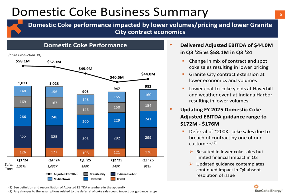 Sales volumes for the segment were 951,000 tons in Q3 2025, compared to 1,027,000 tons in the same period last year. In response to these challenges, SunCoke updated its full-year 2025 Domestic Coke adjusted EBITDA guidance range to $172-$176 million, reflecting the impact of the customer contract breach and market conditions.