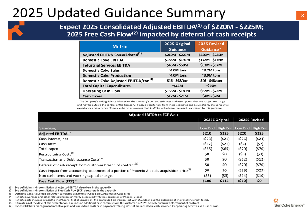In light of the Phoenix Global acquisition and operational challenges, SunCoke has updated its full-year 2025 guidance. The company now expects consolidated adjusted EBITDA of $220-$225 million, compared to its original guidance of $210-$225 million. However, this revised range includes five months of Phoenix Global results, masking underlying weakness in the core Domestic Coke business.