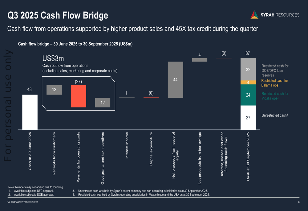 Of the US$87 million cash balance, US$60 million is restricted (US$32 million for DOE/DFC loan, US$4 million for Balama operations, and US$24 million for Vidalia operations), leaving US$27 million as unrestricted cash for general corporate purposes.