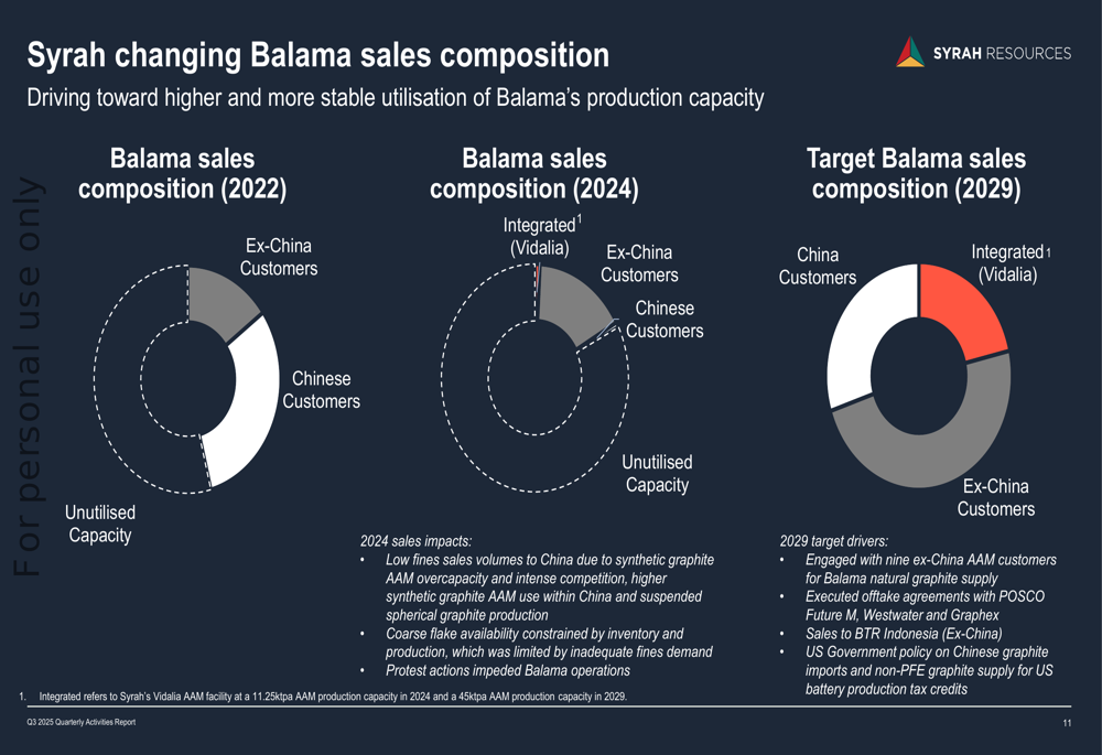 Syrah is actively working to reshape its sales composition, reducing reliance on the Chinese market and focusing on higher-value customers in ex-China markets and vertical integration through its Vidalia facility. The company has engaged with nine ex-China AAM customers for Balama natural graphite supply and has executed offtake agreements with POSCO Future M, Westwater, and Graphex.