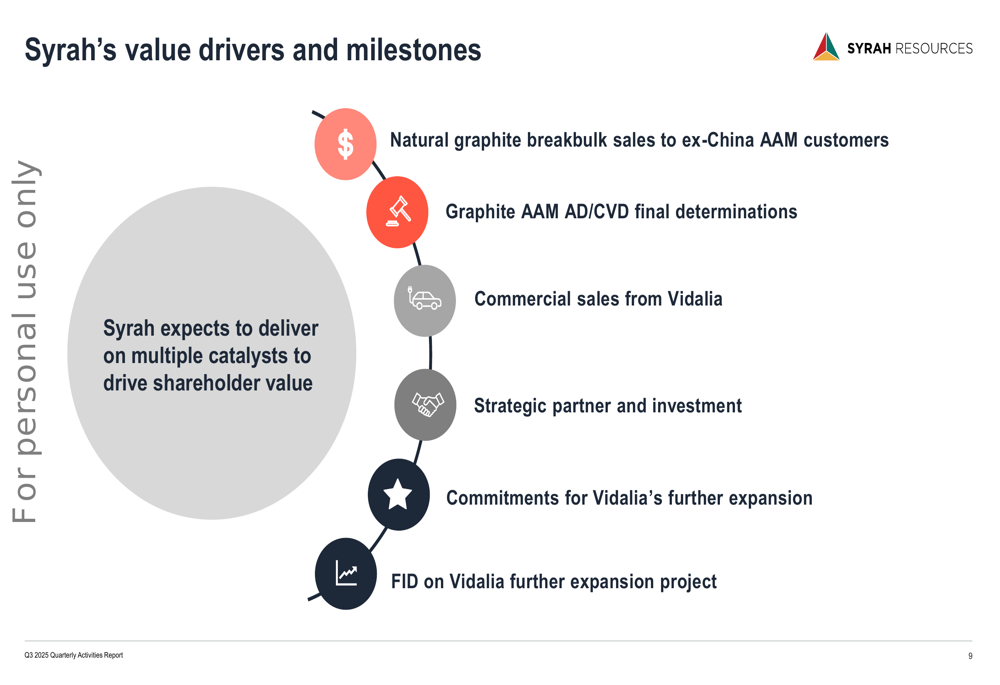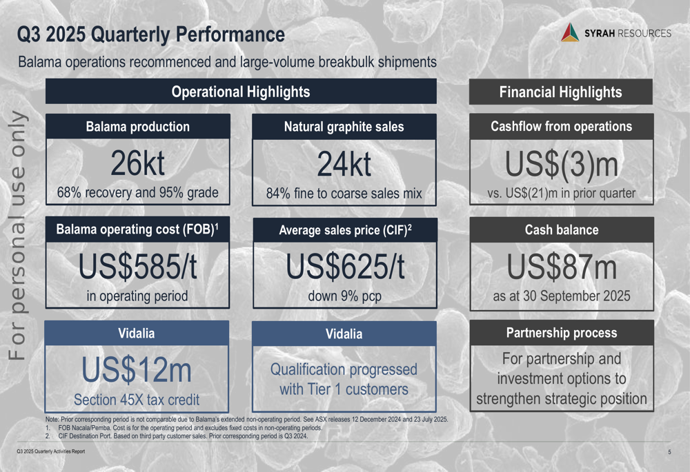 The following slide summarizes Syrah’s key operational and financial metrics for Q3 2025: