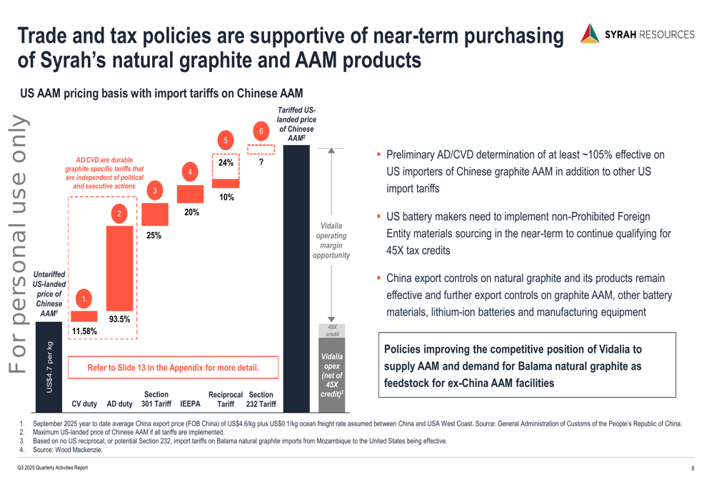 The preliminary anti-dumping and countervailing duties totaling approximately 105% on Chinese AAM imports, combined with Section 301 tariffs (25%) and IEEPA tariffs (20%), have dramatically altered the competitive landscape. These trade policies support Syrah’s strategy to supply US battery manufacturers seeking to qualify for tax credits under the Inflation Reduction Act, which requires non-Prohibited Foreign Entity materials.