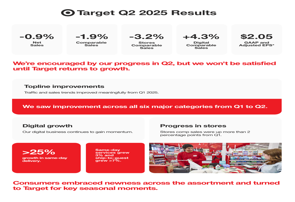 Target’s Q2 2025 results showed a mixed performance with net sales declining 0.9% year-over-year and comparable sales falling 1.9%. However, the company emphasized that these figures represent a meaningful improvement from Q1 2025 performance. Store comparable sales declined 3.2%, while digital comparable sales provided a bright spot with 4.3% growth.