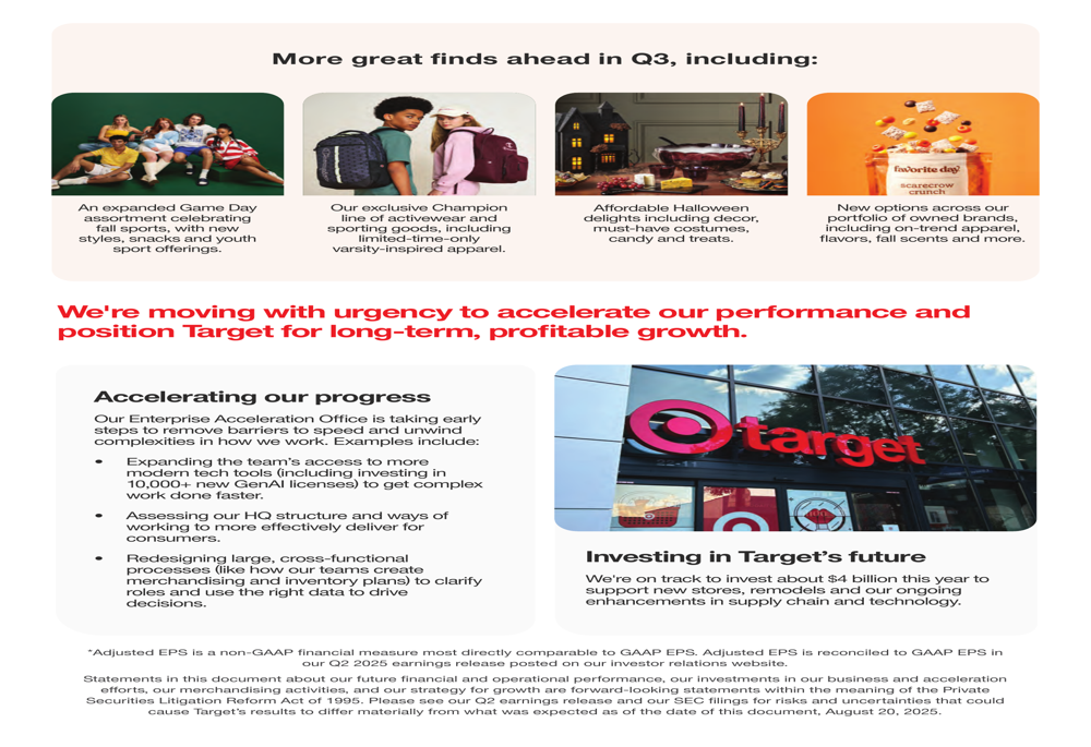 Target identified several key drivers behind its Q2 performance, including strong seasonal merchandise sales and back-to-school initiatives. The company emphasized its focus on affordable offerings, maintaining 2024 prices on top 20 back-to-school items, $5 backpacks, and 35-cent notebooks to attract value-conscious shoppers.