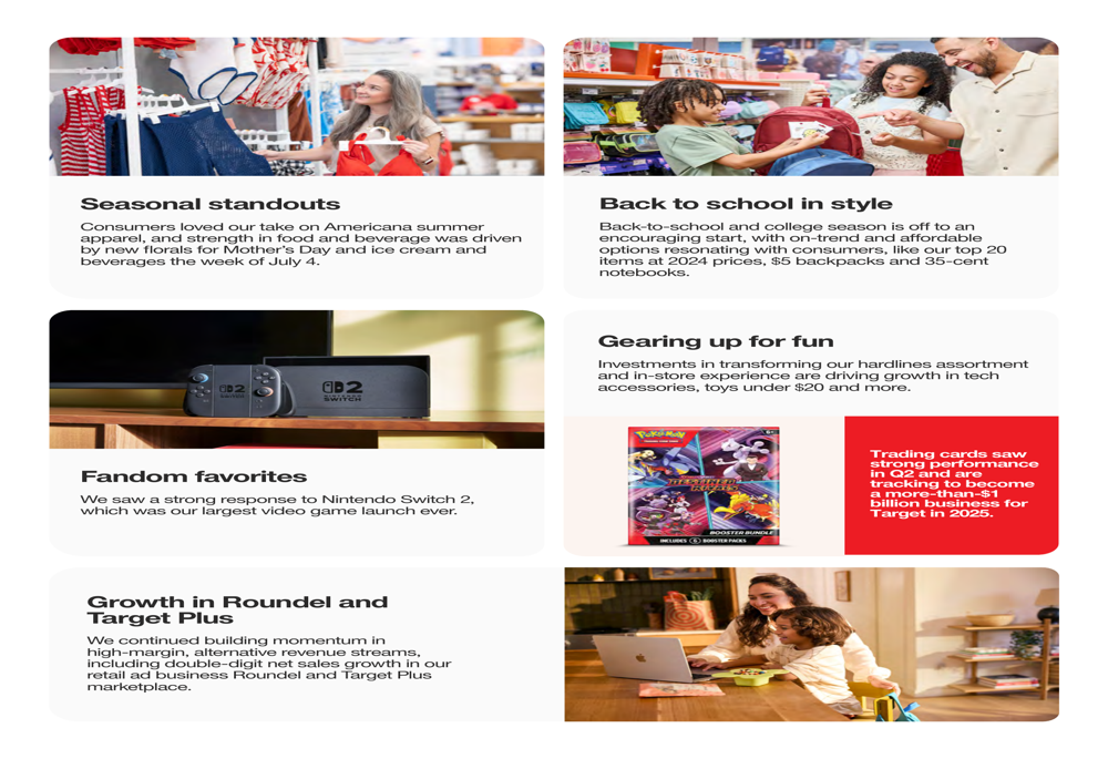 Trading cards emerged as a particularly strong category, with the company noting they are tracking to become a more-than-$1 billion business for Target in 2025. The Nintendo Switch 2 launch also drove significant consumer interest and sales.