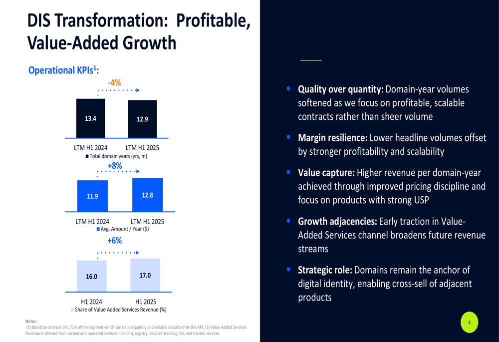 Meanwhile, the Domains, Identity & Software (DIS) segment showed resilience with slight revenue growth despite a 4% decrease in total domain years. The company is focusing on quality over quantity, with average revenue per domain year increasing 8% to $12.80.