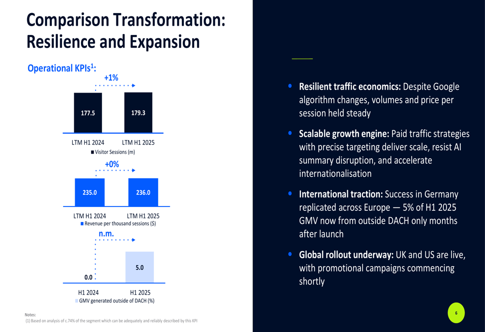 The Comparison segment maintained stable performance with a 1% increase in visitor sessions and flat revenue per thousand sessions. The company highlighted early international expansion, with 5% of gross merchandise value now generated outside the DACH (Germany, Austria, Switzerland) region.