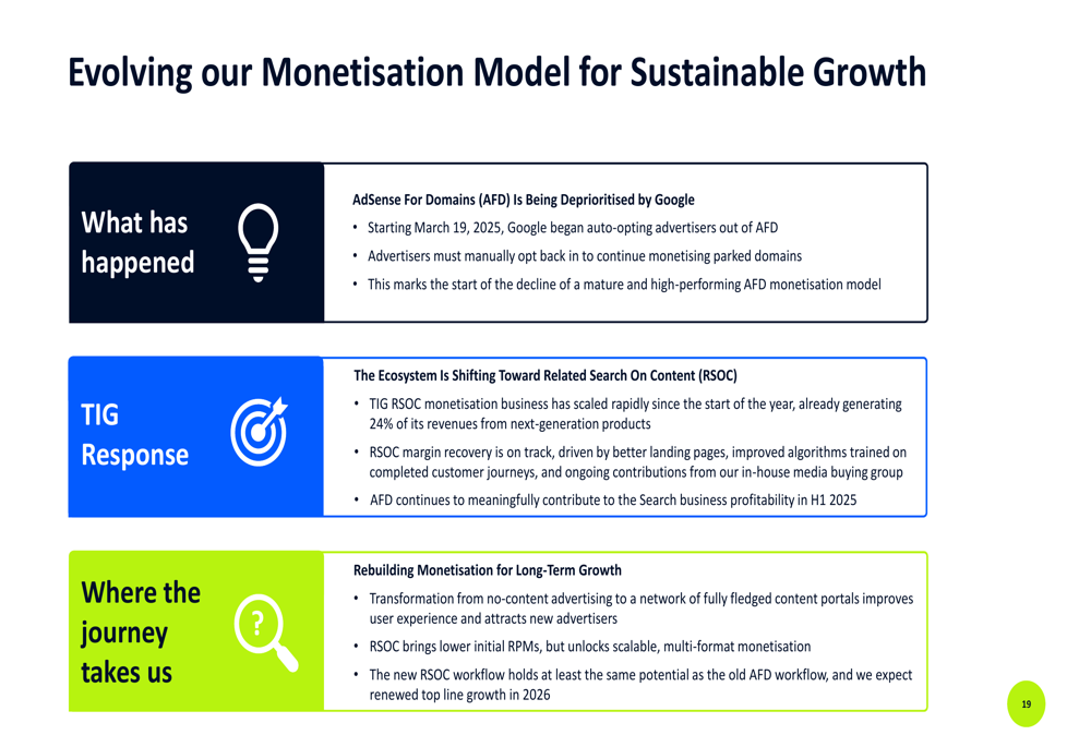 The presentation highlighted Team Internet’s ongoing transition from Google’s AdSense For Domains (AFD) to Related Search On Content (RSOC) monetization models, a shift necessitated by Google’s March 2025 decision to auto-opt advertisers out of the AFD program. This transition has substantially impacted the company’s financial performance in the short term while management positions for future growth.