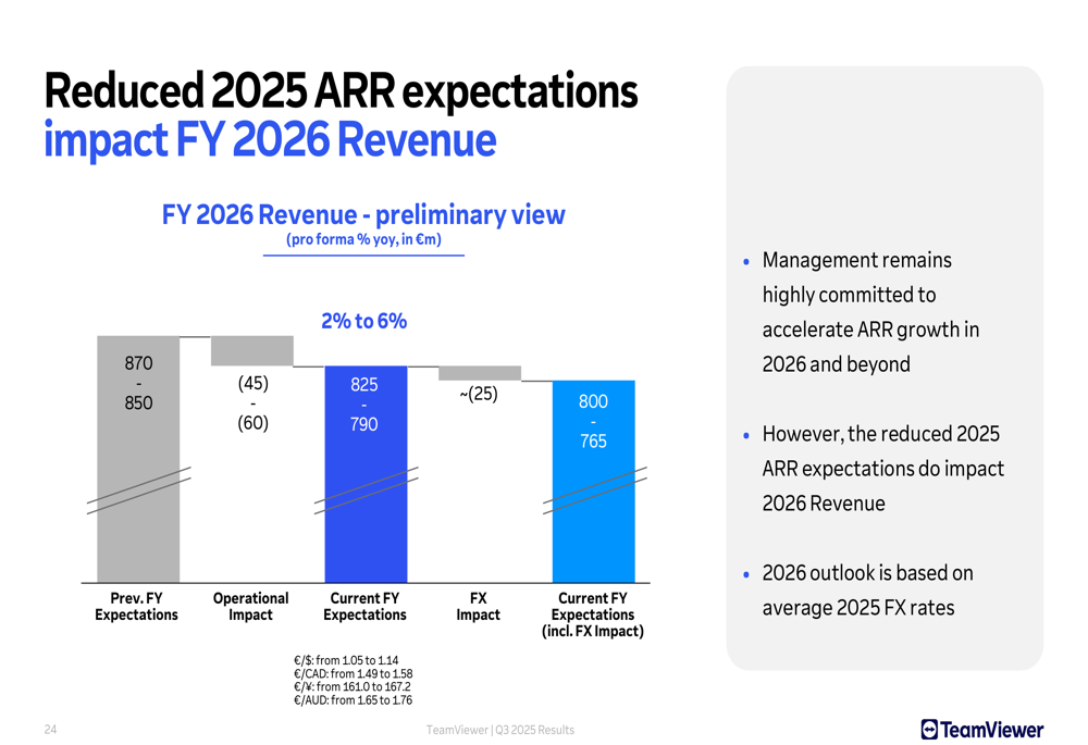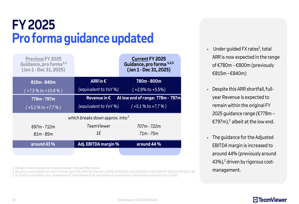 TeamViewer updated its guidance for fiscal year 2025, maintaining its revenue projection of €778-797 million but adjusting ARR expectations. The company also provided an initial outlook for 2026, projecting revenue of €790-800 million, which implies growth of approximately 2-6%.