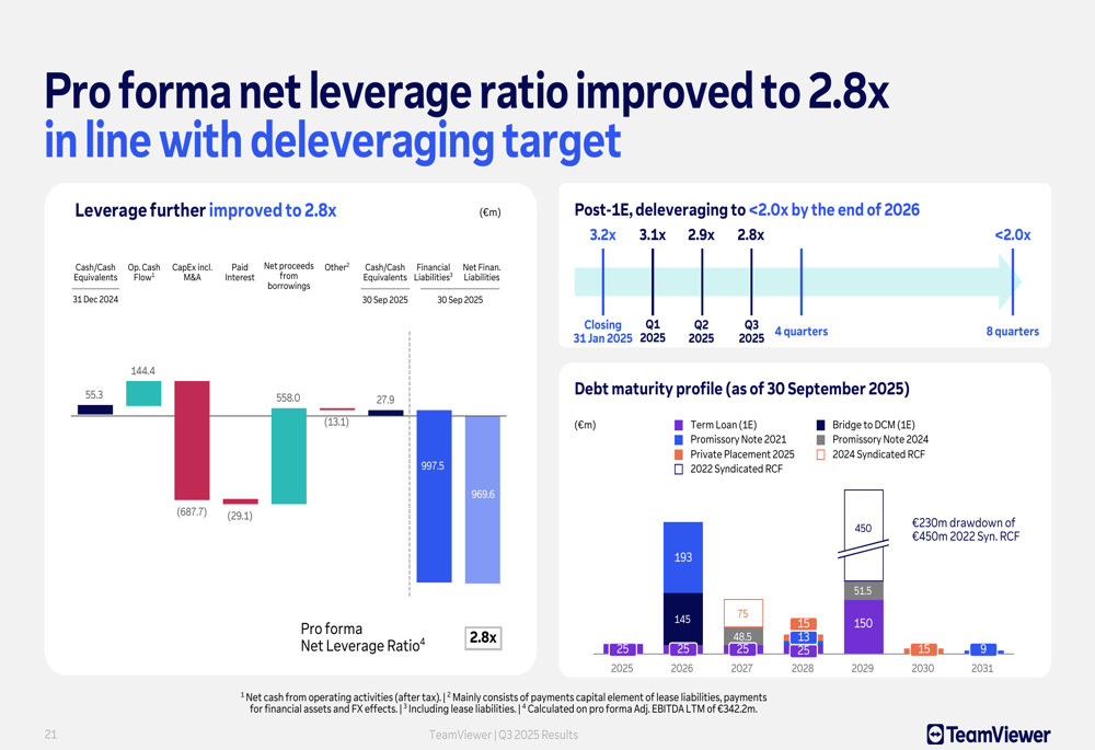 TeamViewer continues to make progress on deleveraging, with its net leverage ratio improving to 2.8x from 2.9x in the previous quarter. The company aims to reduce this ratio to below 2.0x by the end of 2026: