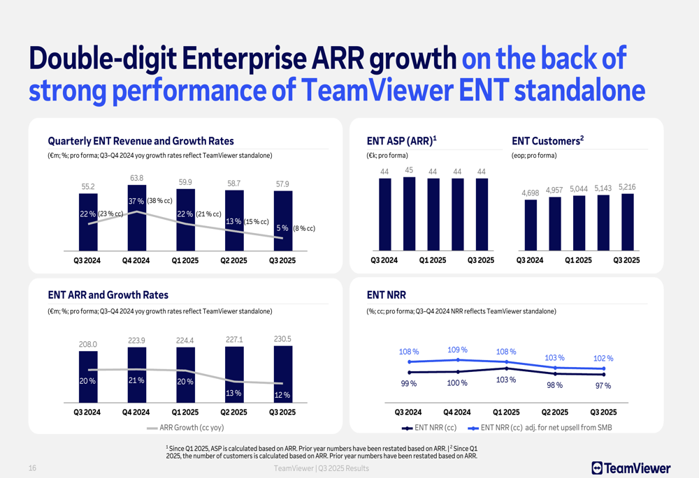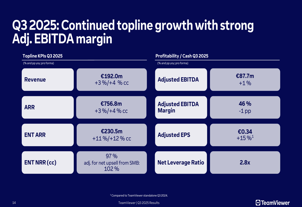 TeamViewer reported modest revenue growth of 4% year-over-year (in constant currency) to €192 million for Q3 2025, maintaining a strong adjusted EBITDA margin of 46%. However, the market’s negative reaction suggests investors were concerned about reduced ARR expectations and ongoing challenges with the company’s 1E integration.