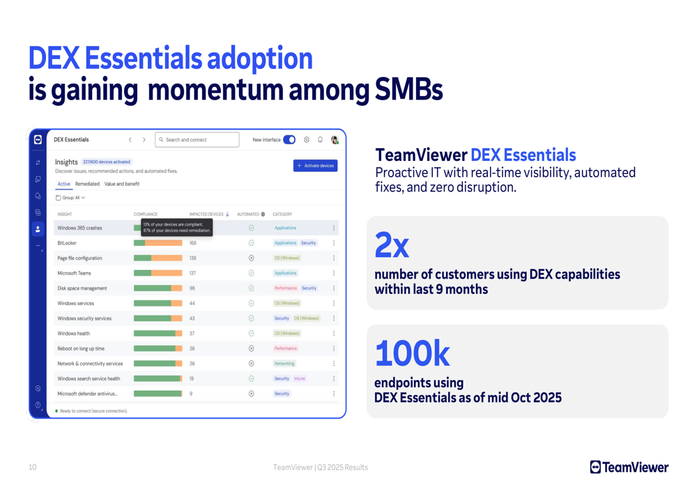 A key component of TeamViewer’s strategy is its SMB-focused DEX Essentials offering, which has seen growing adoption with a reported 2x increase in customers using DEX capabilities within the last nine months and 100,000 endpoints using the solution as of mid-October 2025.