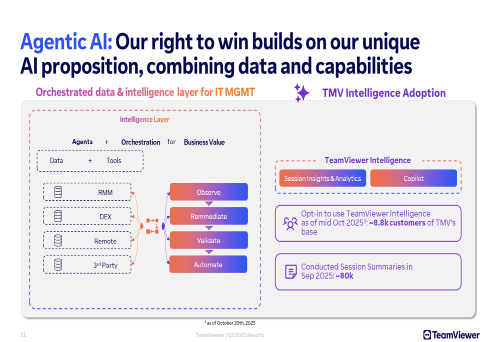 TeamViewer is also advancing its AI strategy, which it calls "Agentic AI," integrating intelligence across its platform. According to the presentation, approximately 8,800 customers have opted in to use TeamViewer Intelligence, with around 80,000 session summaries conducted in September 2025.