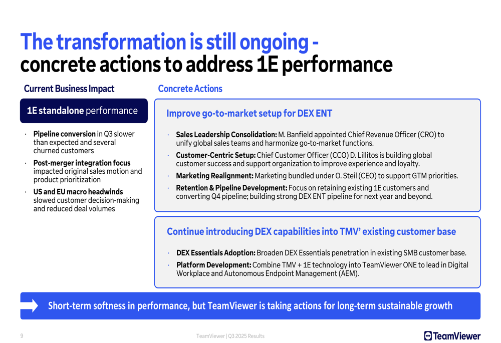 TeamViewer continues to focus on its strategic transformation, particularly the integration of 1E, which it acquired to enhance its digital employee experience (DEX) capabilities. However, the company acknowledged challenges with the 1E standalone performance, citing slower pipeline conversion and macroeconomic headwinds in the US and Europe.