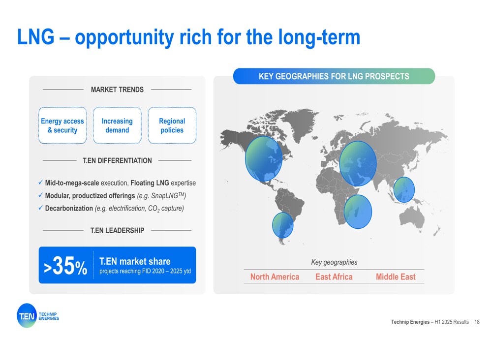 In the LNG market, Technip Energies highlighted its leadership position, claiming over 35% market share in projects reaching Final Investment Decision (FID) between 2020 and 2025 year-to-date. The company’s differentiation in this space includes expertise in mid-to-mega-scale execution, floating LNG, modular offerings (like SnapLNG™), and decarbonization solutions.