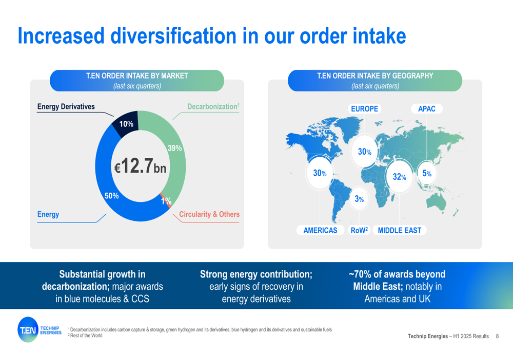 Technip Energies highlighted its strategic focus on diversification, both in terms of markets and geography. The company’s order intake over the last six quarters shows a balanced portfolio, with 39% in decarbonization projects, 50% in energy, and 10% in energy derivatives. Geographically, approximately 70% of awards came from outside the Middle East, with Europe and the Americas each accounting for 30% of order intake.