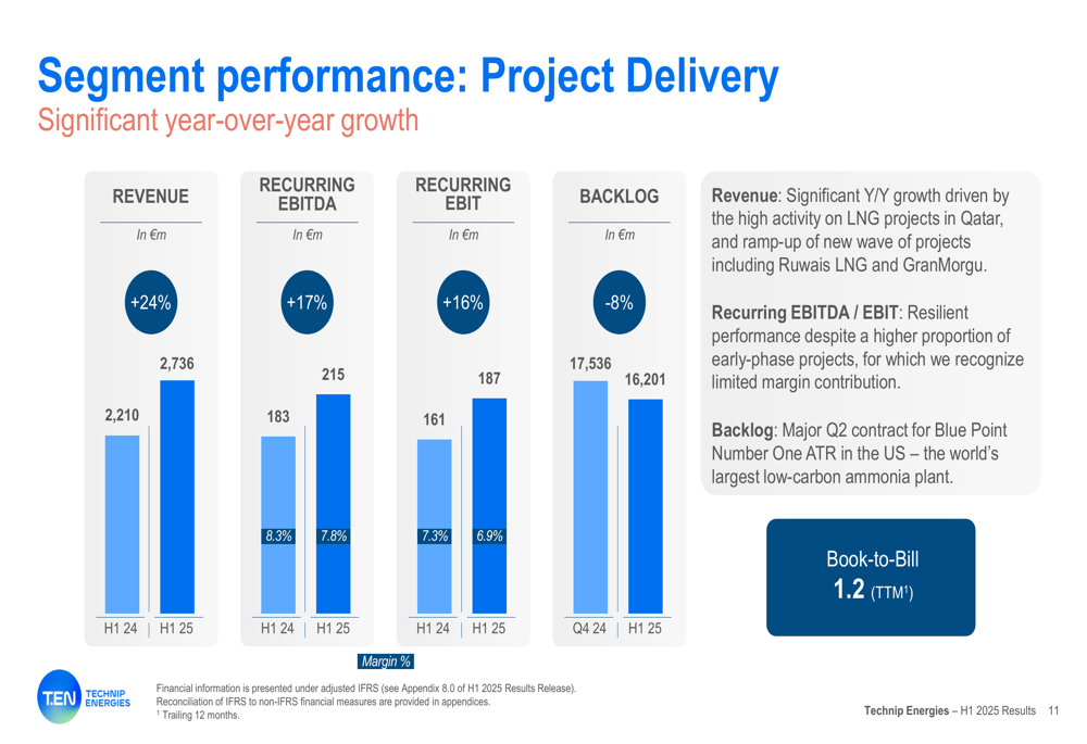 Technip Energies’ performance varied across its two main business segments. The Project Delivery segment, which accounts for approximately 75% of revenue, saw a 24% increase in revenue to €2,736 million, driven by high activity on LNG projects in Qatar and the ramp-up of new projects including Ruwais LNG and GranMorgu.