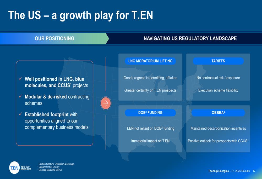 The United States represents a significant growth opportunity for Technip Energies, particularly following the lifting of the LNG moratorium. The company emphasized its strong positioning in LNG, blue molecules, and CCUS projects in the US market, with established footprint and complementary business models.
