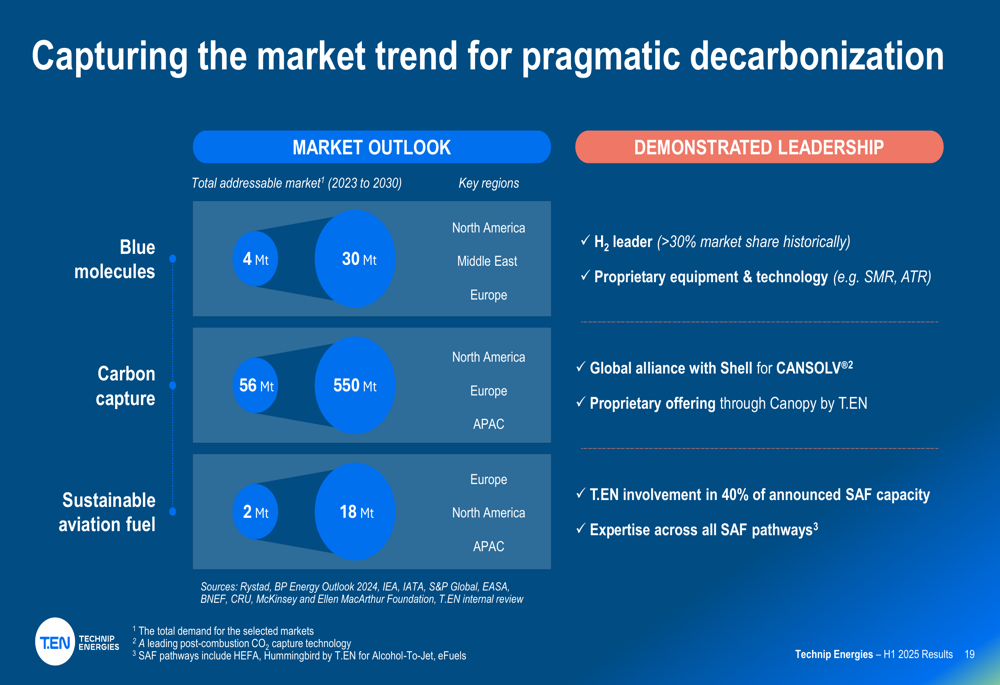 Decarbonization represents another key growth area for Technip Energies. The company presented its strategy for capturing opportunities in blue hydrogen, carbon capture, and sustainable aviation fuel (SAF) markets, all of which are expected to grow substantially by 2030.