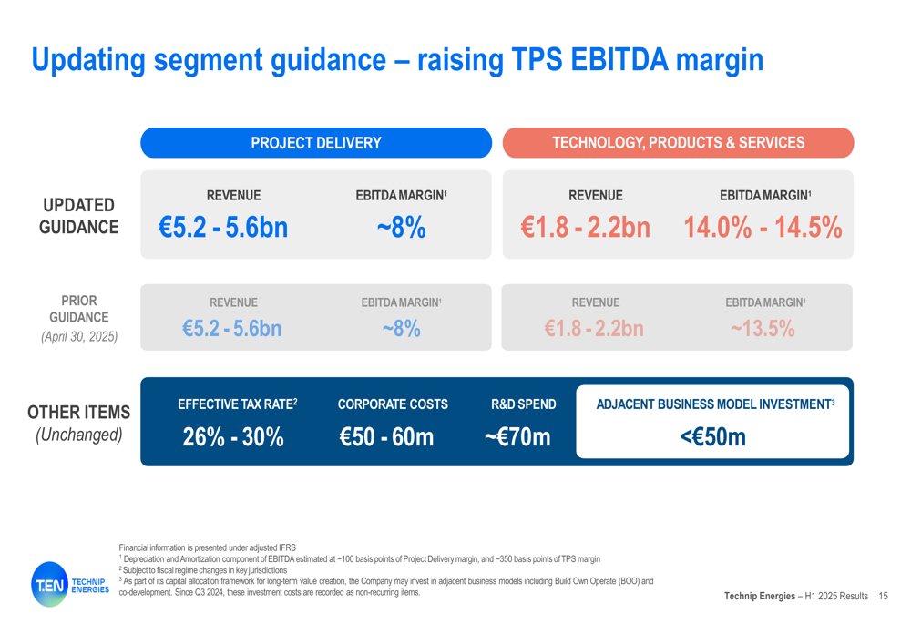 Based on the strong performance in the first half of 2025, Technip Energies updated its full-year guidance, raising the EBITDA margin target for the Technology, Products & Services segment to 14.0-14.5% from the previous guidance of approximately 13.5%. The guidance for the Project Delivery segment remained unchanged at approximately 8% EBITDA margin.