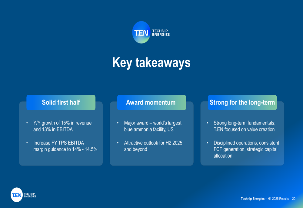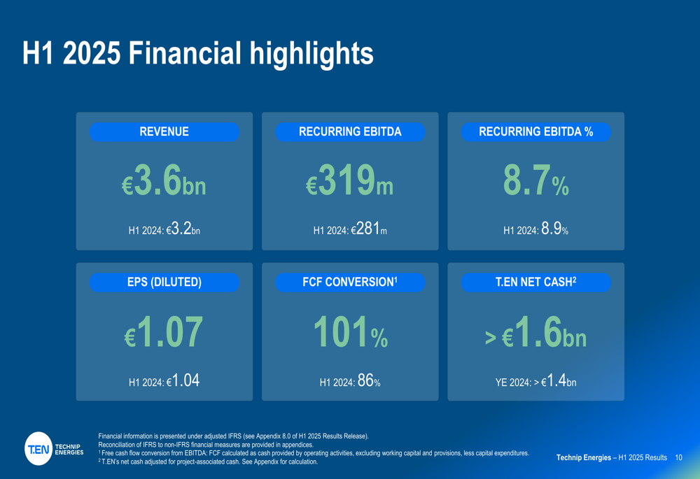 Technip Energies reported strong financial results for the first half of 2025, with material year-over-year growth across key metrics. Revenue increased 15% to €3.6 billion (compared to €3.2 billion in H1 2024), while recurring EBITDA grew 13% to €319 million (up from €281 million).