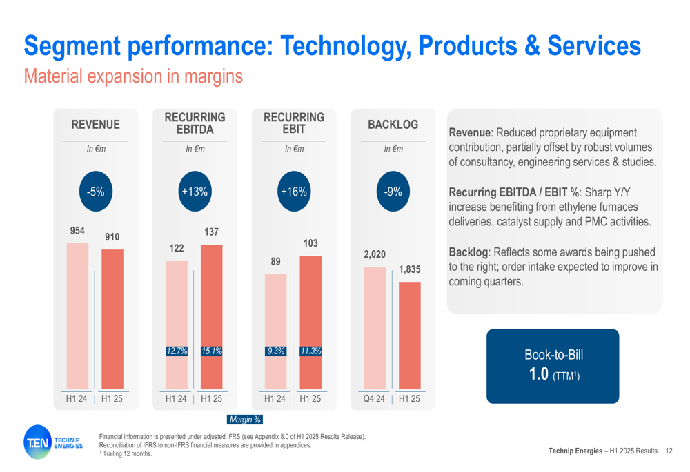 The TPS segment’s recurring EBITDA increased 13% to €137 million, with margin expanding significantly to 15.1% from 12.7% in H1 2024. This strong performance was driven by ethylene furnaces deliveries, catalyst supply, and PMC activities, prompting management to raise the segment’s full-year EBITDA margin guidance.
