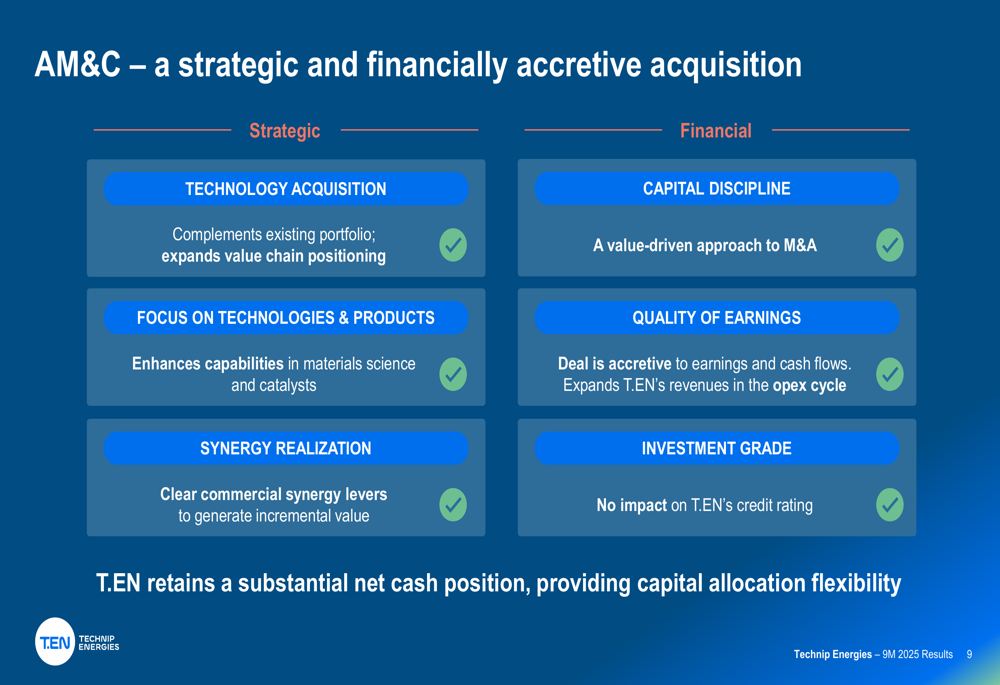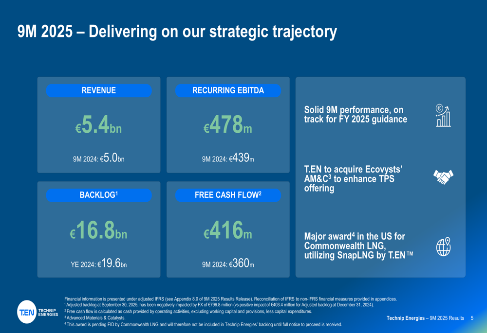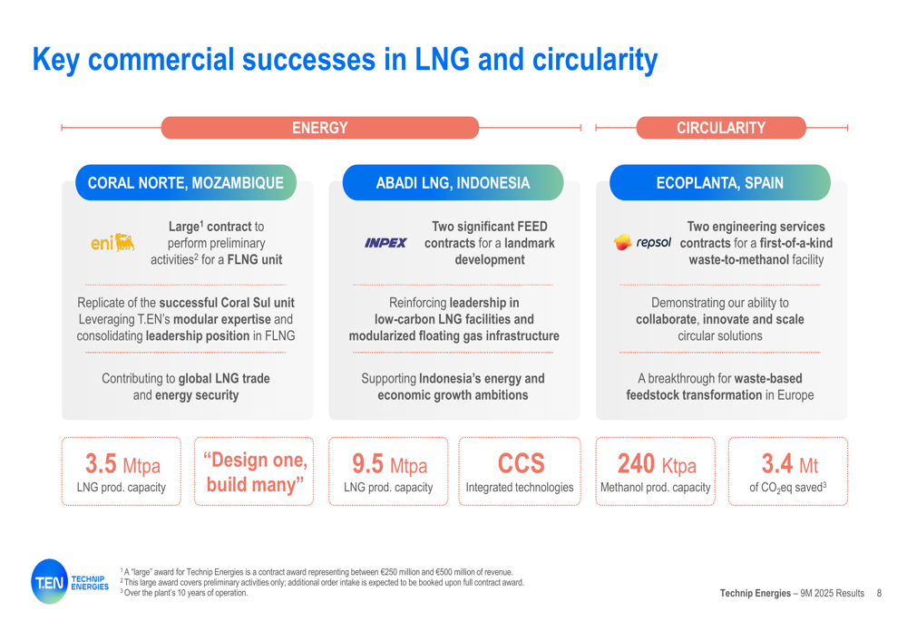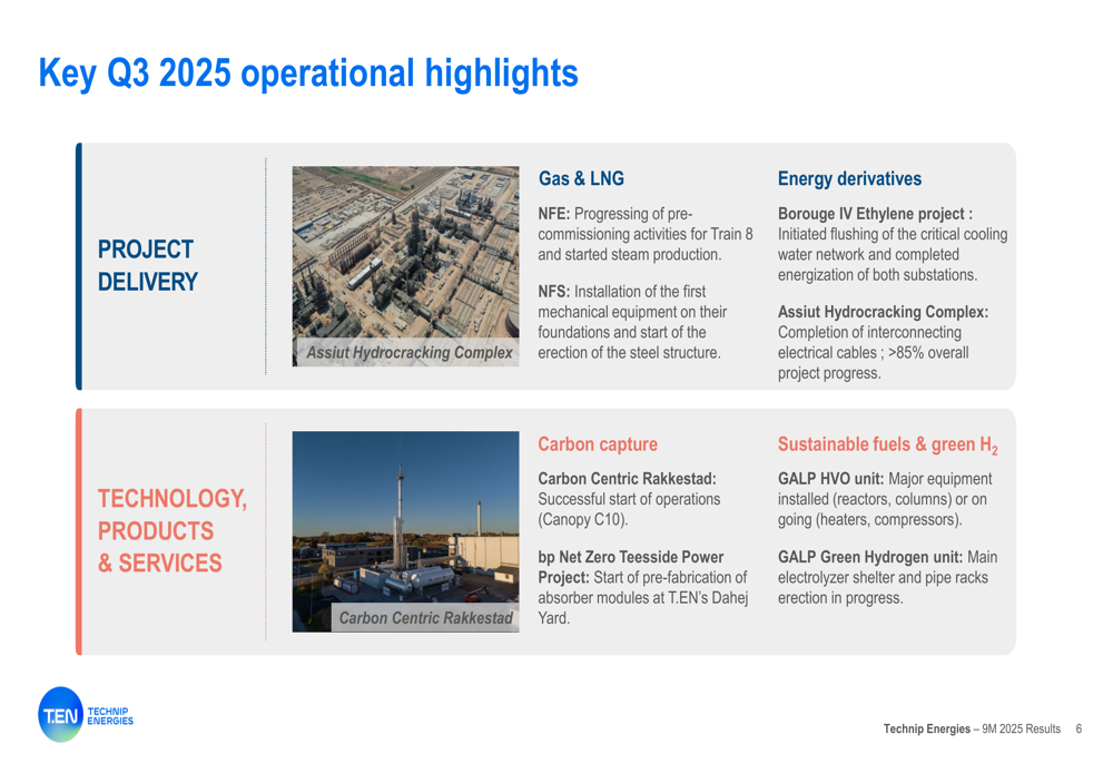 Technip Energies highlighted several operational achievements during Q3 2025, including progress on major LNG projects and energy derivative projects, as well as advancements in decarbonization initiatives: