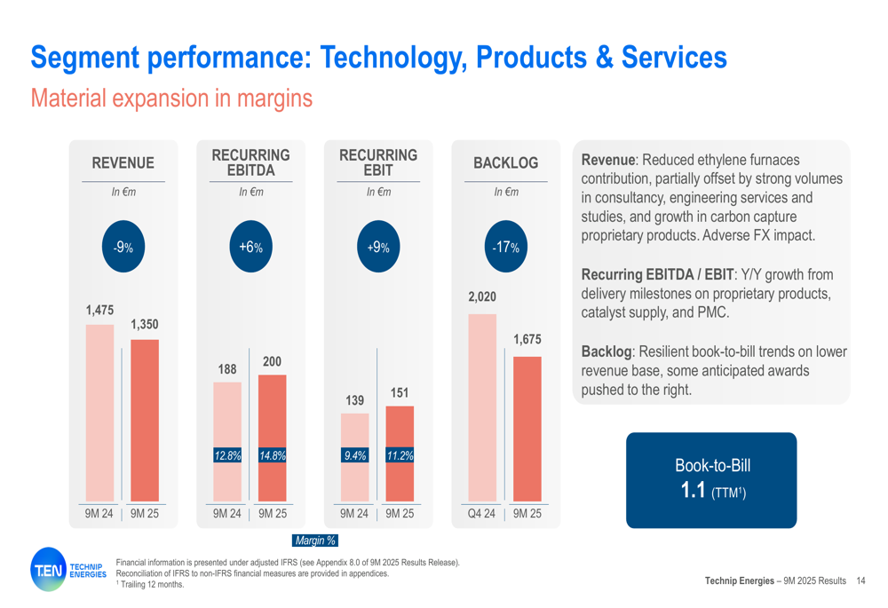 Technip Energies delivered mixed results across its business segments for the first nine months of 2025. The company reported recurring EBITDA of €478 million, representing a 9% increase from the same period in 2024, while diluted earnings per share rose slightly to €1.58 from €1.55.
