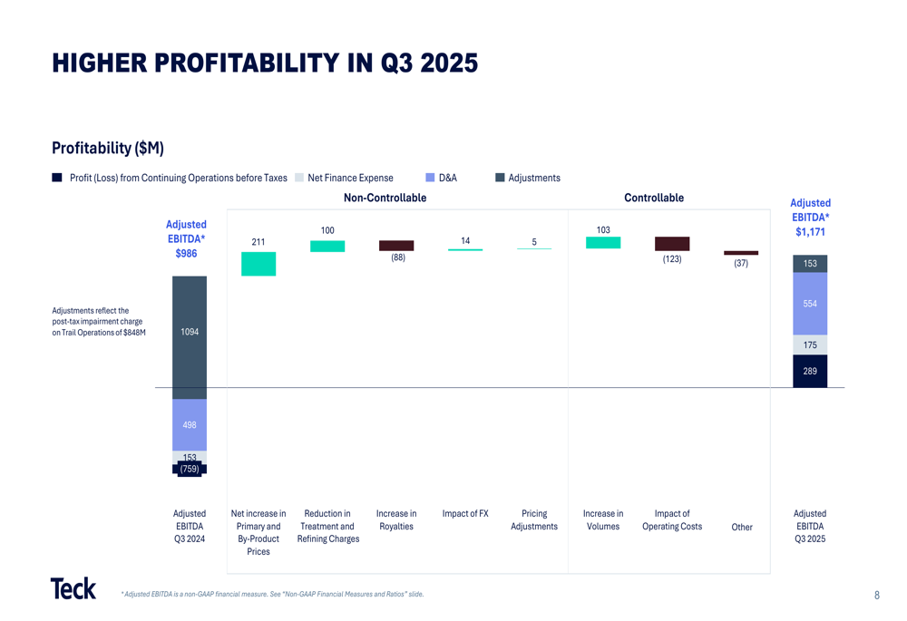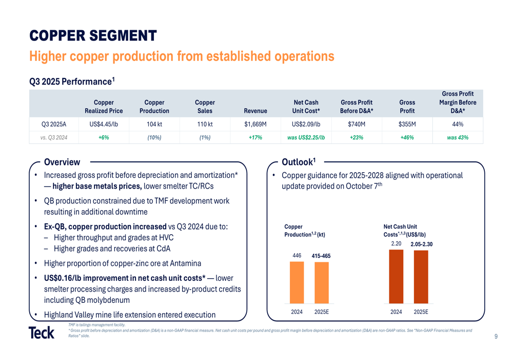 Teck’s financial performance showed significant improvement across key metrics compared to the same period last year. The company reported gross profit before depreciation and amortization of $1.19 billion, up 24% year-over-year, while gross profit increased 38% to $660 million. Profit from continuing operations before taxes reached $289 million, compared to a loss of $759 million in Q3 2024 that reflected an impairment of Trail Operations.