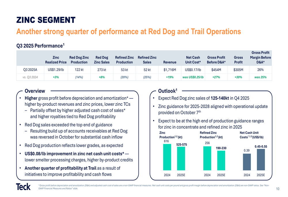 The zinc segment also delivered strong results, with Red Dog zinc sales increasing 8% year-over-year to 273,000 tonnes, despite a 14% decrease in production. Zinc realized prices rose 3% to US$1.29 per pound, while net cash unit costs improved to US$0.17 per pound from US$0.25 in Q3 2024. These factors contributed to a 27% increase in gross profit before depreciation and amortization to $454 million.