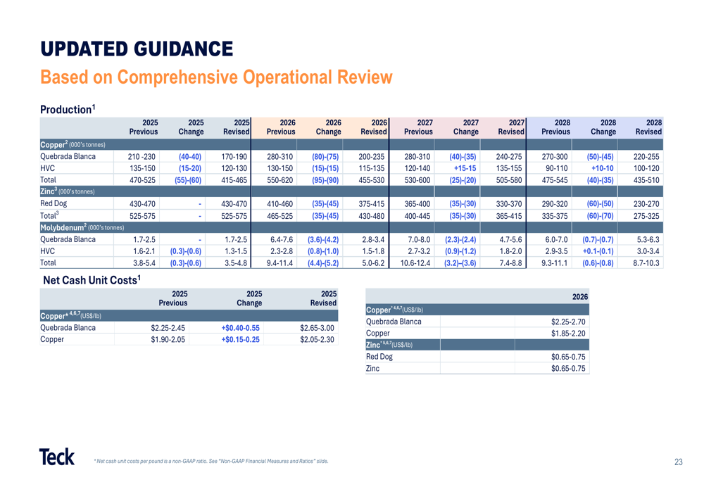 Teck provided comprehensive updated guidance for its operations through 2028. The revised estimates reflect the operational challenges at QB and adjustments to mine plans at other sites.
