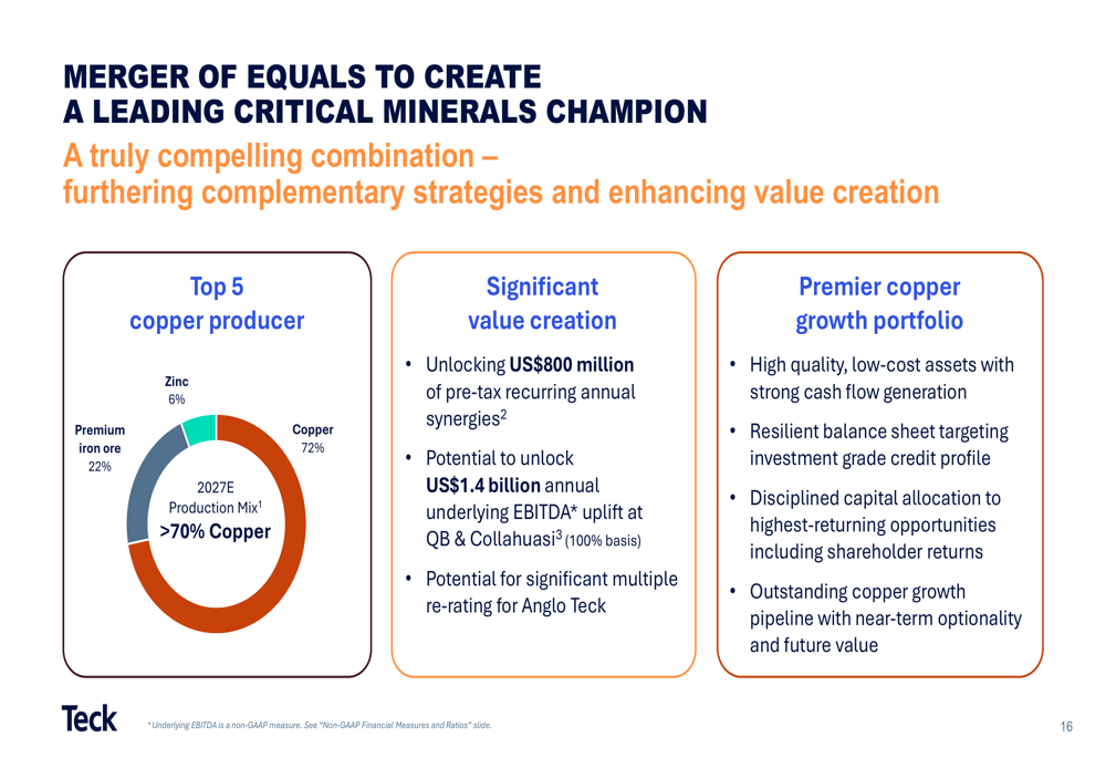 The merger aims to create a premier copper-focused mining company with over 70% of production coming from copper. Management highlighted the expected benefits, including approximately US$800 million in annual synergies and the potential to unlock US$1.4 billion in annual underlying EBITDA uplift from optimizing the Quebrada Blanca and Collahuasi operations.