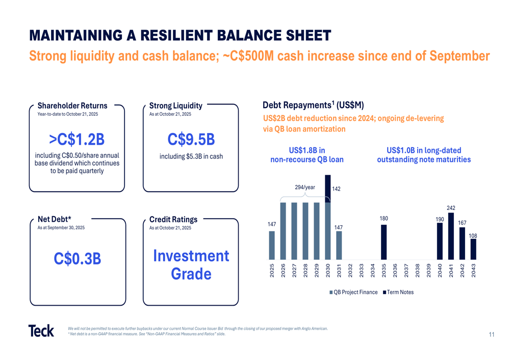 Teck maintained a strong financial position with $9.5 billion in liquidity as of October 21, 2025, including $5.3 billion in cash. Net debt remained low at C$0.3 billion as of September 30, 2025, and the company has maintained its investment grade credit ratings.