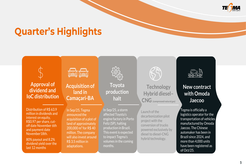 The company also noted that a September 2025 storm affected Toyota’s engine factory in Porto Feliz (SP), halting production in Brazil. This event is expected to impact Tegma’s transport volumes in the coming months, potentially creating headwinds for Q4 performance.