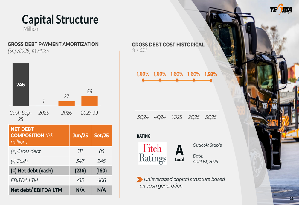 Tegma maintained a strong balance sheet with an unleveraged capital structure based on cash generation. The company’s net cash position stood at R$160 million as of September 2025, down from R$236 million in June 2025, primarily due to dividend distributions and the strategic land acquisition.