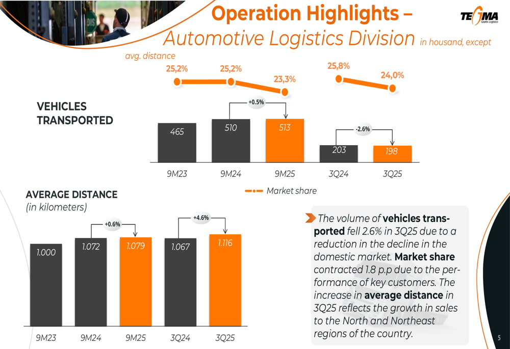 The company’s core Automotive Logistics Division, which accounts for most of its revenue, transported 198,000 vehicles in Q3 2025, representing a 2.6% decrease from the previous year. This resulted in a market share contraction of 1.8 percentage points, primarily attributed to performance challenges among key customers. Despite the volume decline, the division’s revenue increased 7% to R$600 million, benefiting from a 4.6% increase in average transport distance to 1,116 kilometers, reflecting growth in sales to Brazil’s North and Northeast regions.