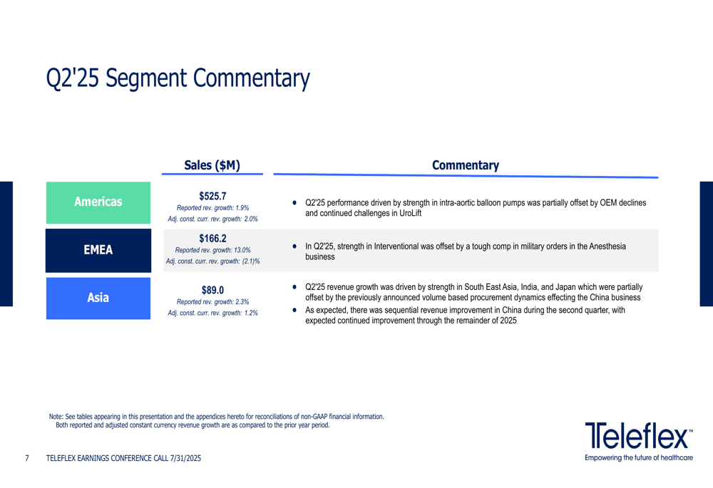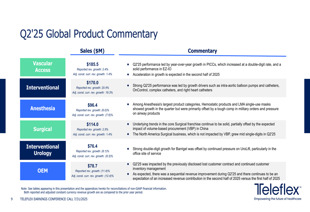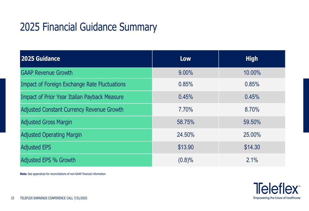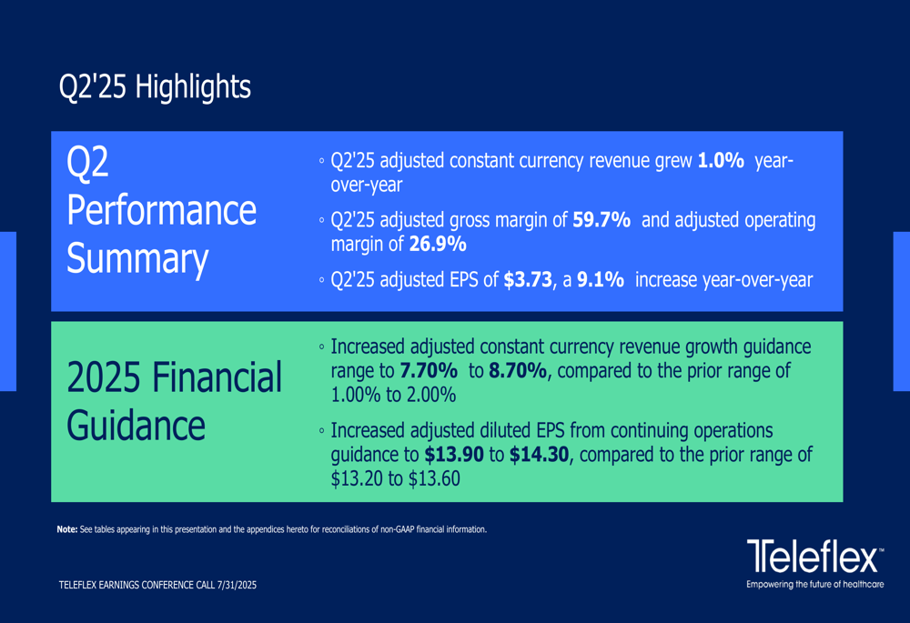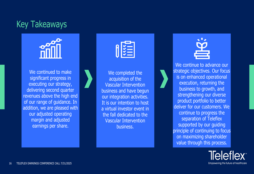 Teleflex summarized the key takeaways from its Q2 2025 performance, emphasizing its execution of strategic objectives and delivery of revenues above guidance. The company highlighted the completion of the Vascular Intervention business acquisition and ongoing integration activities as significant milestones.