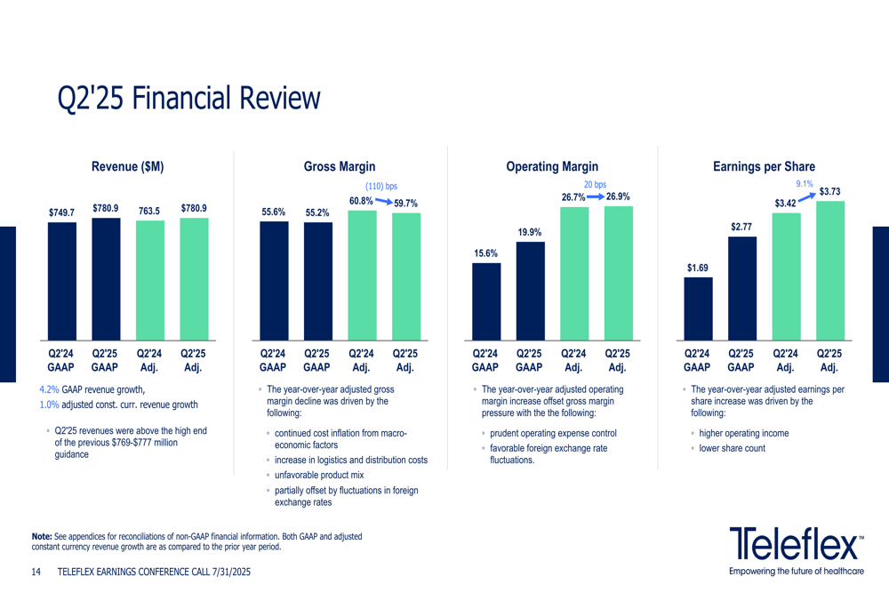 Teleflex reported Q2 2025 revenue of $780.9 million, representing 4.2% reported growth and 1.0% adjusted constant currency growth year-over-year. Adjusted earnings per share reached $3.73, a 9.1% increase from the prior year, driven by higher operating income and a lower share count.