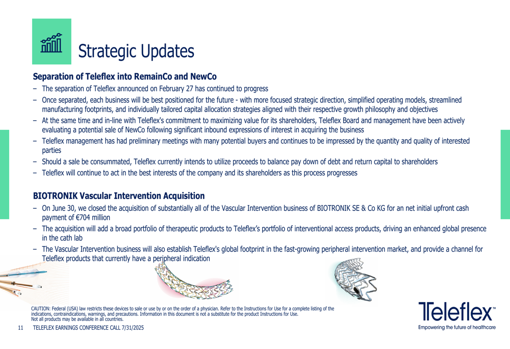 Looking ahead, Teleflex appears positioned for stronger growth in the second half of 2025, driven by its recent acquisition and strategic initiatives. However, challenges remain in segments like Interventional Urology and OEM, which will require continued management attention. The company's planned separation continues to progress, with management focused on maximizing shareholder value through this transformation.
