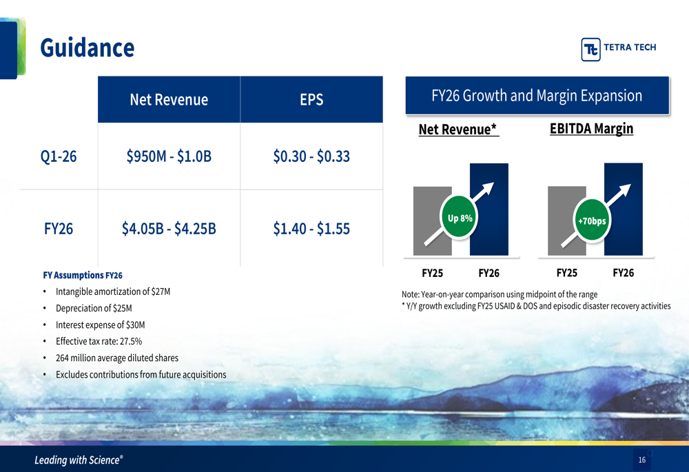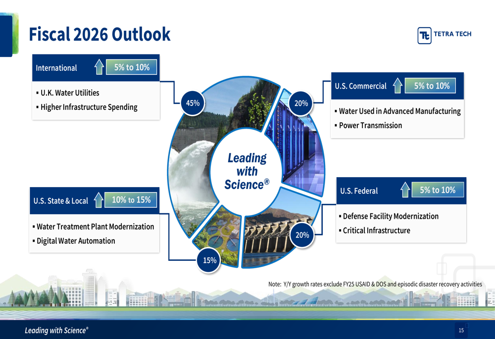 For fiscal year 2026, Tetra Tech provided guidance for net revenue between $4.05 billion and $4.25 billion, with EPS projected in the range of $1.40 to $1.55. The company expects continued growth across all customer segments, with U.S. State & Local projected to lead with 10-15% growth, driven by water treatment plant modernization and digital water automation initiatives.