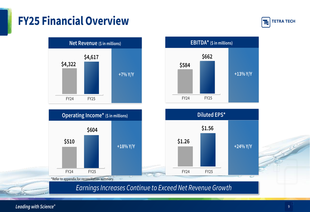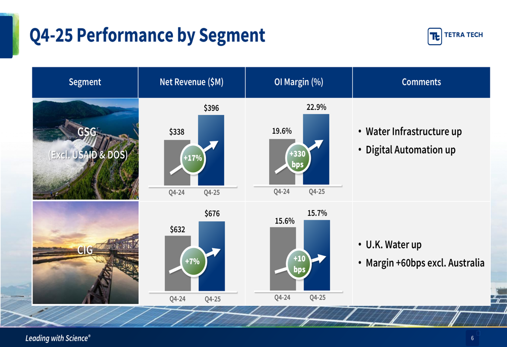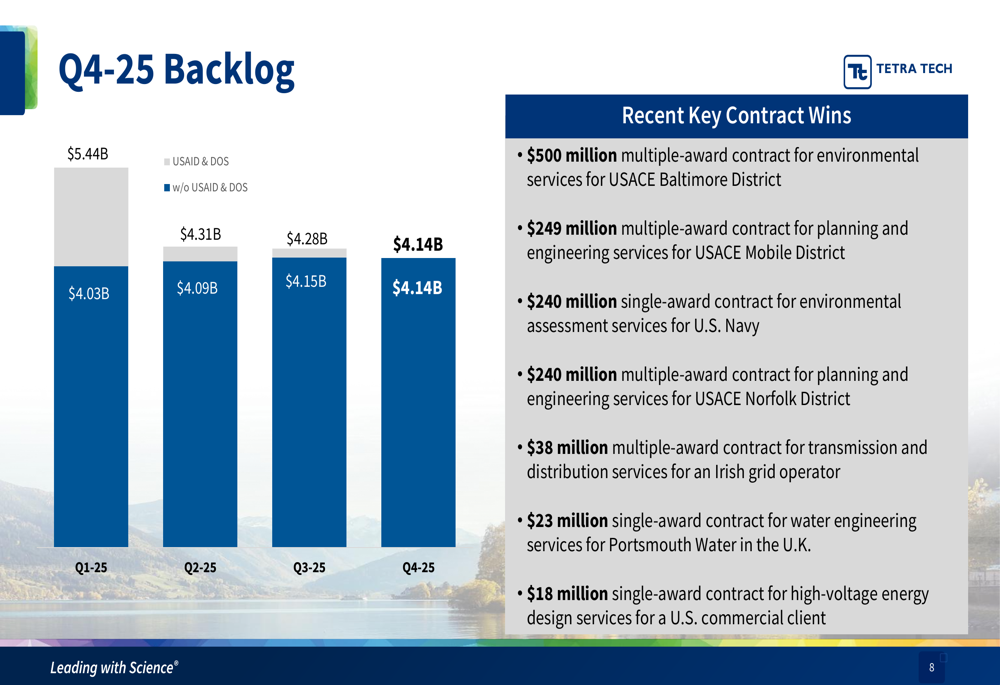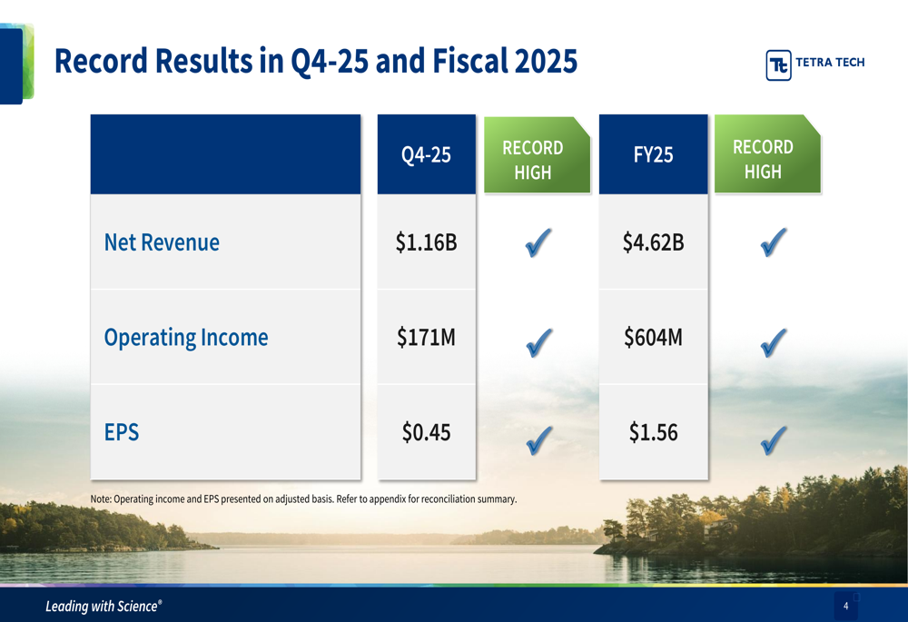 Tetra Tech reported record Q4-25 results with net revenue of $1.16 billion, operating income of $171 million, and earnings per share of $0.45. Excluding contributions from USAID and DOS, the company achieved impressive year-over-year growth with net revenue up 10%, operating income increasing 23%, and EPS rising 29%.