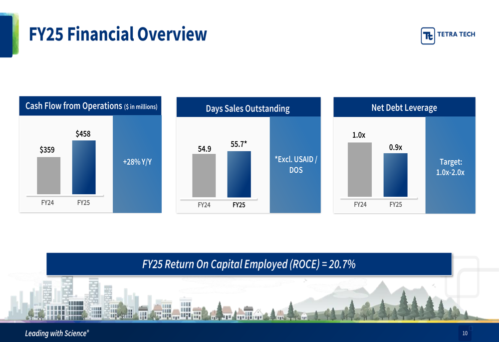 In terms of capital allocation, Tetra Tech returned $315 million to shareholders through dividends and share repurchases during FY25, while increasing its quarterly dividend by 12% year-over-year. The company also completed strategic acquisitions of SAGE and Carron & Walsh to strengthen its technical capabilities and market position.