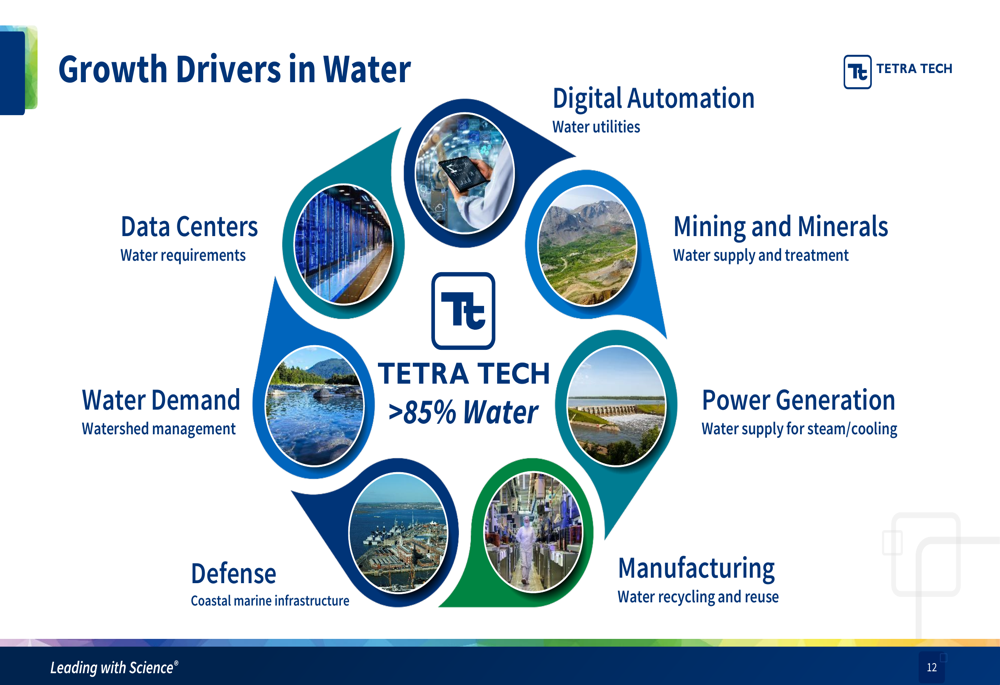 Tetra Tech's strategic focus on water-related services continues to drive growth, with over 85% of revenue derived from water projects. The company identified several key growth drivers in the water sector, including digital automation, data centers, mining and minerals, power generation, manufacturing, and defense.