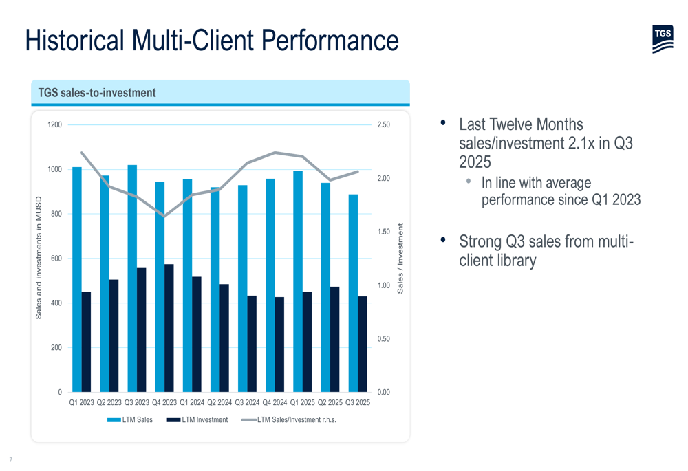 TGS’s multi-client segment continues to be a key revenue driver, generating $226 million in Q3 2025. While this represents a decrease from $277 million in Q3 2024, the company maintained a healthy sales-to-investment ratio of 2.1x over the last twelve months, in line with its historical performance.