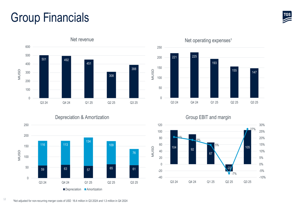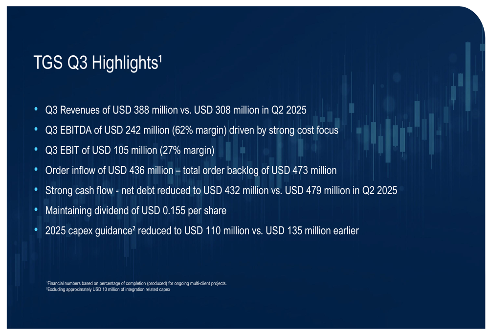 TGS reported Q3 2025 revenues of $388 million, representing a 26% increase from the $308 million recorded in Q2 2025, though remaining flat compared to the same quarter last year. The company achieved an impressive EBITDA of $242 million, translating to a robust 62% margin, while EBIT reached $105 million with a 27% margin.