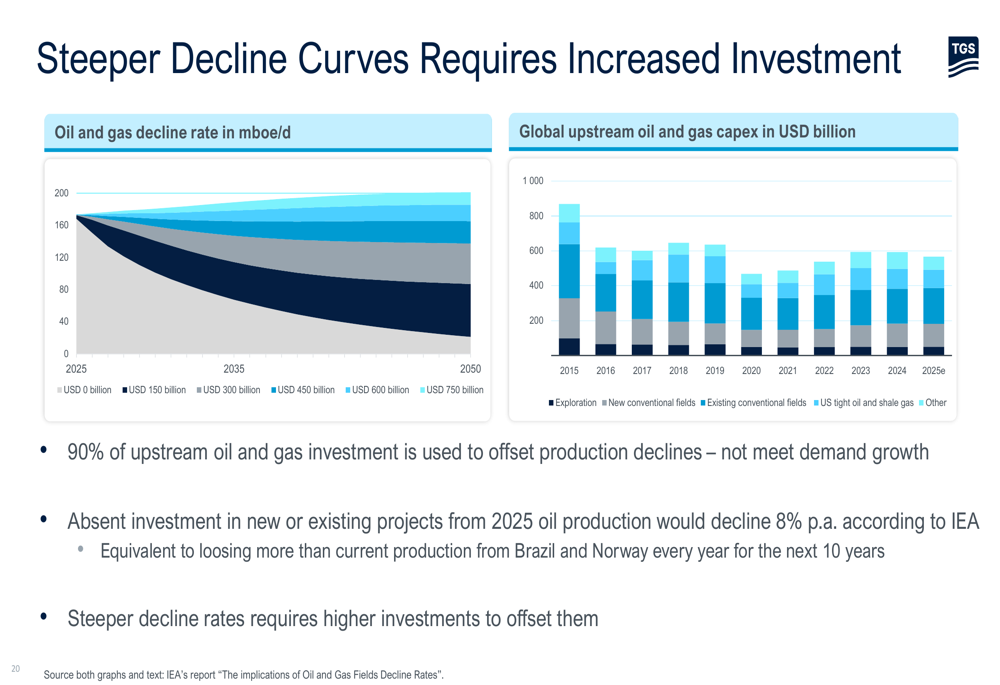 TGS highlighted the structural challenges facing the energy exploration industry, with steeper decline curves requiring increased investment. Without continued investment, oil production would decline by approximately 8% annually from 2025, according to the company’s presentation: