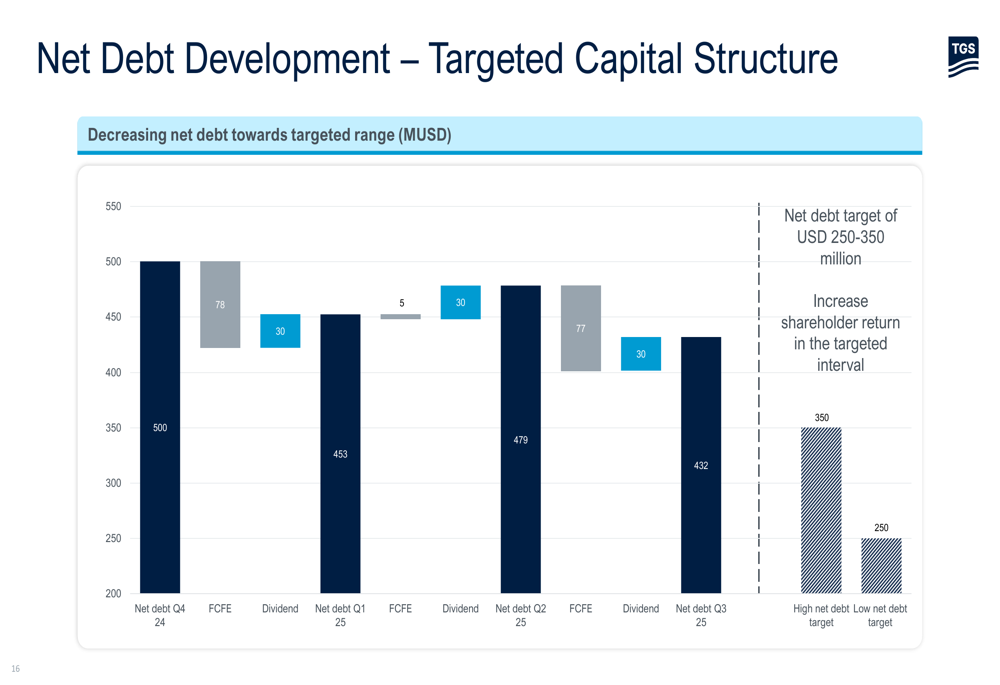 TGS continues to make progress on its debt reduction strategy, with net debt decreasing to $432 million in Q3 2025, down from $500 million at the end of 2024. This moves the company closer to its targeted capital structure with net debt in the $250-350 million range: