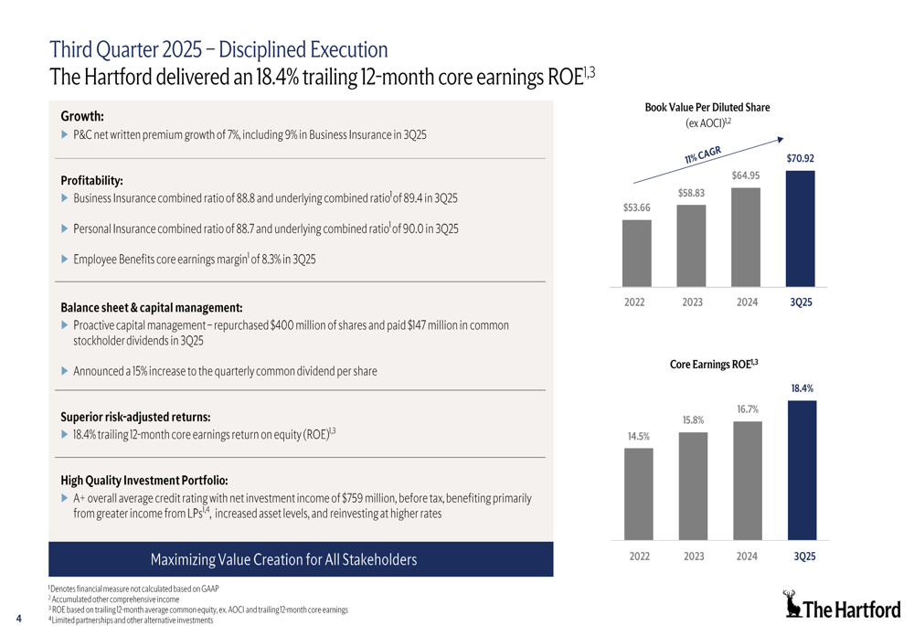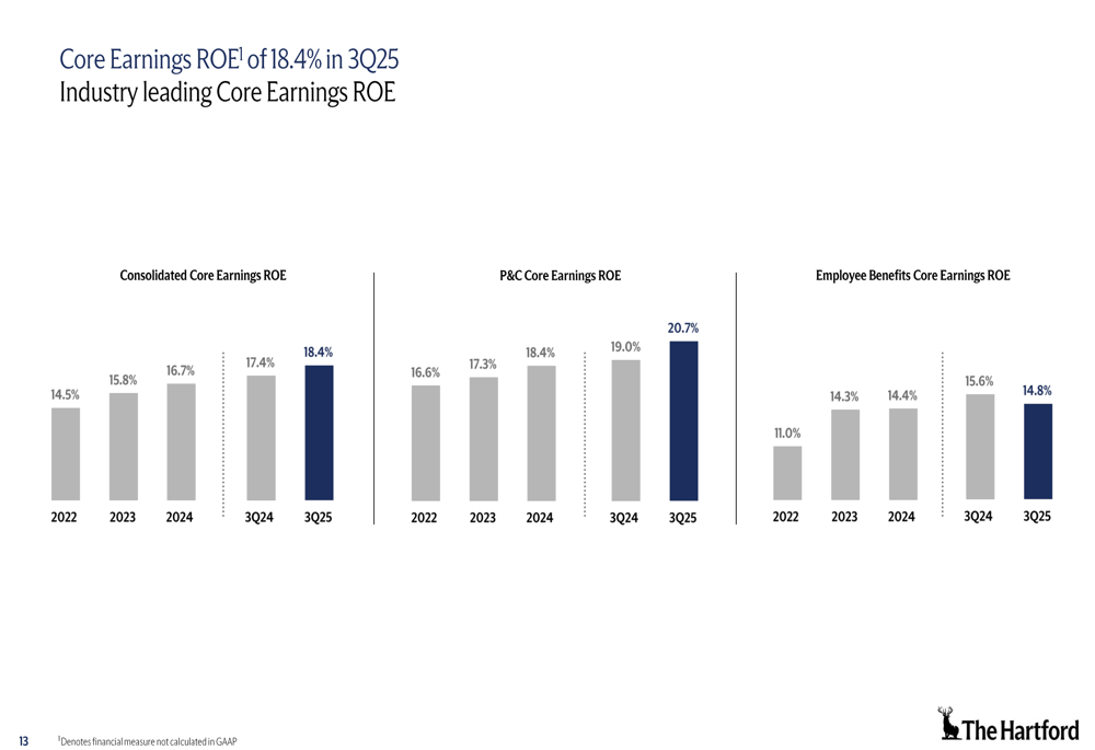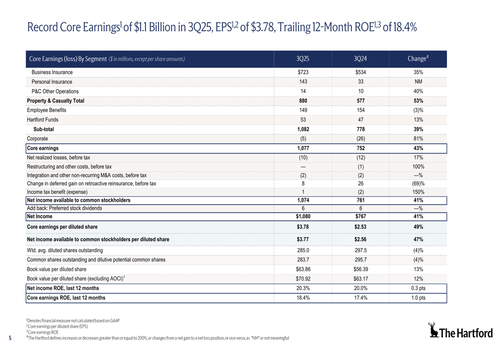 The Hartford delivered record core earnings of $1.1 billion in the third quarter, representing a 43% increase from the $752 million reported in Q3 2024. This performance translated to core earnings per diluted share of $3.78, up from $2.53 in the same period last year.